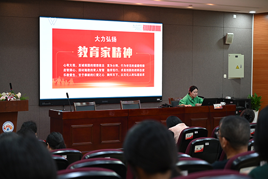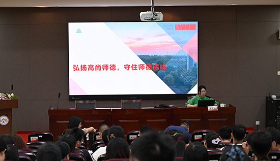 王博士學(xué)識(shí)淵博,貫通中西。她引經(jīng)據(jù)典,從中國(guó)古代經(jīng)典《禮記?學(xué)記》《師說(shuō)》到國(guó)外學(xué)者培根、雅思貝爾斯關(guān)于師德的論述,從內(nèi)在修養(yǎng)與外在行為兩個(gè)維度,深入闡釋了師德師風(fēng)的豐富內(nèi)涵。期間,王博士分享了一系列真實(shí)的反面案例,并結(jié)合習(xí)近平總書(shū)記提出的好老師 “四個(gè)標(biāo)準(zhǔn)”,警示全體教師要堅(jiān)守“三個(gè)堅(jiān)持、三個(gè)突出、四個(gè)嚴(yán)格、四個(gè)強(qiáng)化”的師德底線(xiàn),筑牢思想防線(xiàn)。講座最后,王博士還就教育家精神進(jìn)行了講解,強(qiáng)調(diào):要堅(jiān)定理想信念,爭(zhēng)做胸懷“國(guó)之大者”的典范。