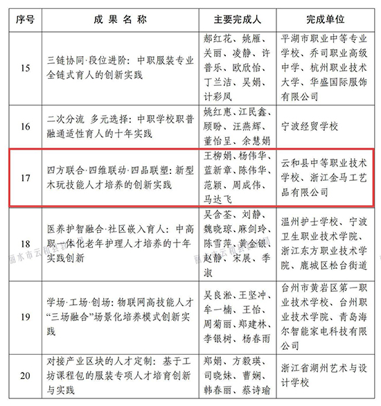 近日,浙江省教育廳正式公布2025年浙江省教書育人杰出貢獻獎名單。云和縣中等職業(yè)技術學校的教學成果《四方聯合?四維聯動?四品聯塑:新型木玩技能人才培養(yǎng)的創(chuàng)新實踐》榮獲教學成果獎一等獎!這是學校繼2017年、2021年兩度獲得教學成果獎后,在職業(yè)教育創(chuàng)新發(fā)展道路上的又一次重要突破。