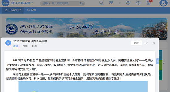 9月15日至21日是國家網(wǎng)絡(luò)安全宣傳周,為深入學(xué)習(xí)宣傳貫徹習(xí)近平總書記關(guān)于網(wǎng)絡(luò)強(qiáng)國的重要思想,積極響應(yīng)湖州市教育系統(tǒng)網(wǎng)絡(luò)安全宣傳周活動(dòng),浙江信息工程學(xué)校·湖州工程技師學(xué)院開展以“網(wǎng)絡(luò)安全為人民,網(wǎng)絡(luò)安全靠人民——以高水平安全守護(hù)高質(zhì)量發(fā)展”為主題,開展了一系列豐富多彩的宣傳教育活動(dòng)。