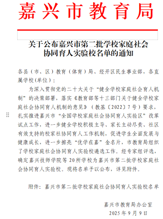 近日,嘉興市教育局公布第二批學(xué)校家庭社會協(xié)同育人實(shí)驗(yàn)校名單,嘉善信息技術(shù)工程學(xué)?!短剿?ldquo;四共建二融合一橋梁” 家校社協(xié)同育人新生態(tài):陽光成長指導(dǎo)中心賦能學(xué)生全面發(fā)展》的優(yōu)秀實(shí)踐案例成功入選。
