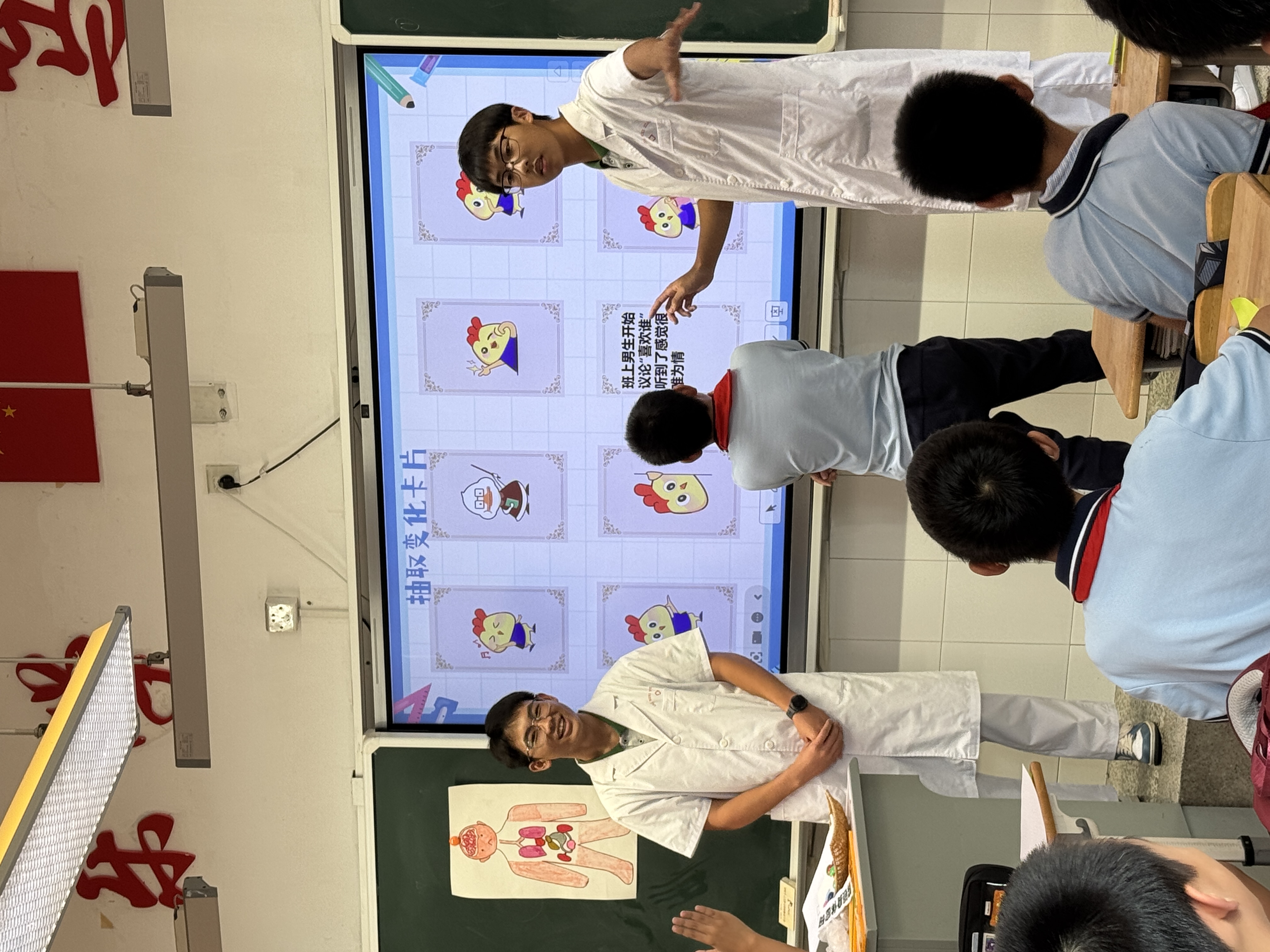 活動以抽卡互動開場,孩子們抽取“變化卡片”,分享自己對身體變化的感受。學(xué)校學(xué)生引導(dǎo)大家認(rèn)識到,身高增長、聲音變化、月經(jīng)初潮、遺精等現(xiàn)象都是自然的成長過程,無需緊張或害羞。學(xué)生巧妙運用“身體升級系統(tǒng)”的比喻,將人體比作精密儀器,生動解釋生理變化的意義。例如“聲帶如琴弦拉長,音調(diào)由童聲轉(zhuǎn)為成人音域”“新陳代謝促進(jìn)細(xì)胞更新”等講解,讓孩子們在趣味中理解身體的“升級”過程?,F(xiàn)場設(shè)置了問答和“刮刮應(yīng)對策略”游戲環(huán)節(jié),小學(xué)生踴躍提問,學(xué)校學(xué)生耐心解答,傳授正確使用衛(wèi)生巾、應(yīng)對月經(jīng)和遺精等實用知識,幫助孩子們建立自我保護(hù)意識?;顒犹貏e強(qiáng)調(diào)“個體差異”,通過展示男女青春期發(fā)育時間表,讓孩子們理解發(fā)育早晚皆屬正常,學(xué)會尊重自身節(jié)奏,不比較、不焦慮,接納獨一無二的自己。