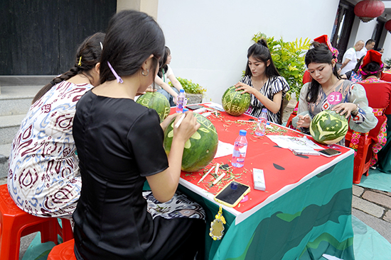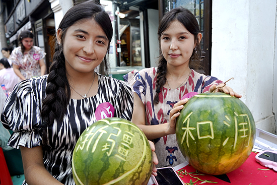 身著維吾爾族傳統服飾的學子們,很快成了街區(qū)里最先“點亮”視線的風景:他們全情投入雕刻,指尖的刻刀在翠綠瓜皮上靈活游走:時而輕劃勾勒江南紋樣的柔婉線條,時而凝神精雕細節(jié)處的精巧弧度,吸引了大批游客駐足。