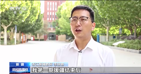 報(bào)道中,浙江省玉環(huán)市援疆教師李斌傲接受采訪。他表示:“作為一名95后援疆教師,我第一期援疆結(jié)束后,又主動(dòng)申請(qǐng)?jiān)僖淮卧?,投身援疆倍感光榮。我們要接續(xù)努力,一批接著一批干,為新疆教育水平提升和人才培養(yǎng),盡自己所能做好工作,傳承‘胡楊精神’,和新疆各族干部群眾一起譜寫(xiě)中國(guó)式現(xiàn)代化新疆篇章。”