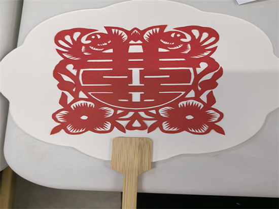 學(xué)員們熱情高漲,紛紛拿起剪刀嘗試。有的學(xué)員專注于傳統(tǒng)“喜”字的精準(zhǔn)裁剪,力求展現(xiàn)經(jīng)典紋樣的對稱之美;有的學(xué)員則大膽創(chuàng)新,將安吉本地的竹元素、山水元素融入花紋設(shè)計,讓“喜”字多了幾分地域特色。隨著剪刀的開合,一張張紅紙逐漸變成了造型各異的“喜”字,有的靈動飄逸,有的飽滿厚重。完成剪紙后,學(xué)員們小心翼翼地將“喜”字粘貼在素色扇面上,原本樸素的扇子瞬間煥發(fā)生機,紅色的“喜”字與扇面的素雅相得益彰,既保留了剪紙藝術(shù)的傳統(tǒng)韻味,又賦予了扇子文創(chuàng)產(chǎn)品的實用價值,真正實現(xiàn)了“傳統(tǒng)剪紙+現(xiàn)代文創(chuàng)”的完美融合。