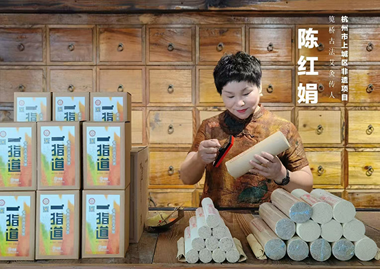 她勤修內功,加快推進古法艾灸的創(chuàng)新發(fā)展,有意識地進行傳統(tǒng)醫(yī)藥知識產權的保護。筧橋古法艾灸項目以祖?zhèn)靼瑮l配方、百字銘文、扶陽固本“四部灸法”和特色專用灸具為主要特色其中秘制大艾條是核心技藝的重要載體,成為筧橋古法艾灸的立足之本。陳紅娟懷著“抱元守一的思想(“元”指古法艾灸,“一”則是仁愛之道),經過多年的專業(yè)學習,為大眾的養(yǎng)生之道研究新的路徑,目前已全面掌握 5 根大艾條的配方、古法制作技藝和辨證施治要領,并在祖?zhèn)鞣鲫柟瘫?ldquo;四部灸法”的基礎上,針對人體不同部位的經絡走勢,不斷拓展灸法的實踐?,F(xiàn)研發(fā)推出的主要產品有:扶陽大艾條、至尊灸條、寶寶艾、防疫細艾、貴妃灸條等,并已成功申報注冊商標“筧橋古法”“一指道”“杭十八”“南宋御艾”和“宋韻江南”;針對艾灸操作費力費時、過量艾煙污染環(huán)境關鍵技術設備落后等問題,進行針對性的技術攻關成功研制并申請實用新型專利“定點回旋灸”和外觀設計專利“艾灸儀”;拓展衍生產品艾草膏、艾草浴包、艾尖茶、艾草暖貼、艾草枕、艾草香品等若干??紤]“五根大艾條”之一的“扶陽灸”(又名“扶陽固本灸”)已面世10年,各項技術要領和實操經驗均已成熟,她擴大研發(fā)團隊,建全禪城保護檔案,保護祖?zhèn)髋浞?,重啟剩余四根大艾條“駐世灸”“調神灸”“痿蹙灸”“通體灸”的復活工作。