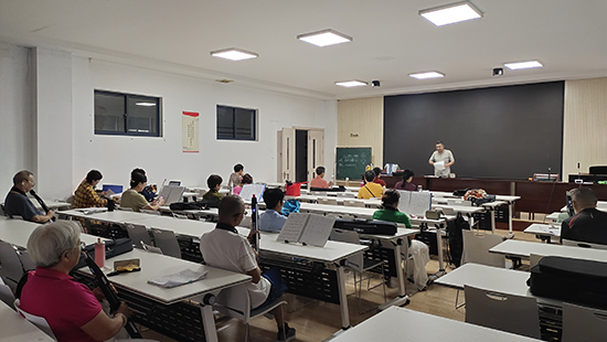 此次培訓(xùn)特別邀請到資深電吹管演奏者劉偉華擔(dān)任授課教師。課堂上,劉偉華老師結(jié)合學(xué)員們的初級學(xué)習(xí)需求,從電吹管的基礎(chǔ)操作技巧、氣息控制方法等內(nèi)容入手,逐步引導(dǎo)大家熟悉樂器。當(dāng)天的培訓(xùn)重點(diǎn)圍繞經(jīng)典曲目《雁南飛》展開,劉老師通過分解示范、逐句講解的方式,耐心指導(dǎo)學(xué)員們掌握旋律節(jié)奏與情感表達(dá),幫助大家在實(shí)踐中感受電吹管演奏的魅力。