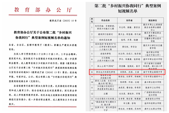 近日,教育部辦公廳公布了第二批“鄉(xiāng)村振興 你我同行”典型案例短視頻名單,海寧市職業(yè)高級中學(xué)報送的案例《伸向遠(yuǎn)方的綠色夢想》成功入選,展現(xiàn)了學(xué)校在鄉(xiāng)村振興人才培養(yǎng)方面的突出成效。