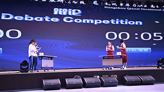 學生技能比賽先通過“聽力+閱讀”筆試,隨后,進行職業(yè)情景表演和辯論賽。選手在抽取題目后10分鐘準備,然后在90—120秒內完成情境表演。同樣的,辯論賽選手準備后,在4分鐘內正方反方展開激烈辯論。選手們反應敏捷、表達流暢,用英語化解臨場挑戰(zhàn),展現(xiàn)出扎實的語言功底和團隊協(xié)作力。