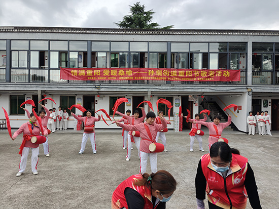 活動在孫端老年學校學員的腰鼓表演《中華全家?!分欣_帷幕。歡快的鼓點、鮮艷的服飾,再加上老年學員們熱情洋溢的表演,立刻讓在場的老人們沉浸在了節(jié)日的喜慶氛圍中。
