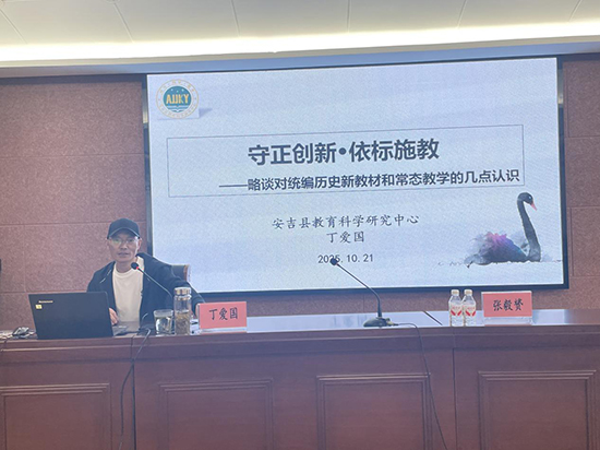 安吉縣初中社會法治教研員丁愛國老師以《守正創(chuàng)新,依標(biāo)執(zhí)教——略談對統(tǒng)編歷史新教材和常態(tài)教學(xué)的幾點認(rèn)識》為題作講座,丁老師圍繞三大要點展開闡述:首先,介紹八上歷史新教材修訂的總體變化概況——專題史融入通史、課次精簡合并以及各單元內(nèi)容具體修訂;其次,他強(qiáng)調(diào)教師需要關(guān)注近代史中相應(yīng)的宏觀認(rèn)識和重點問題,幫助學(xué)生樹立正確的唯物史觀;最后,丁老師指出教師應(yīng)依標(biāo)執(zhí)教,注重歷史四大聯(lián)系,著重培養(yǎng)學(xué)生學(xué)科思維。