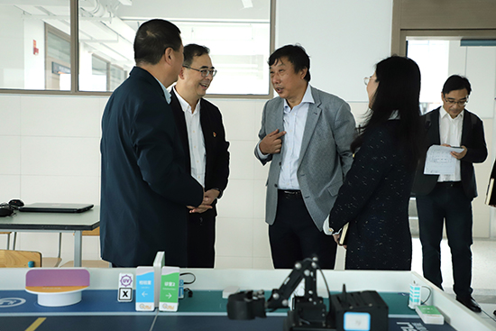 在鄞州職高黨委書記盧科與校長張武劍的陪同下,張慧波書記一行實地考察了校園,先后參觀了學(xué)生寢室、體育館、食堂、圖書館等場所,并深入智能制造、交通運維、供應(yīng)鏈管理、數(shù)智藝術(shù)四大專業(yè)群的現(xiàn)代化實訓(xùn)基地,詳細(xì)了解學(xué)校硬件設(shè)施、教學(xué)環(huán)境和實訓(xùn)室建設(shè)情況。
