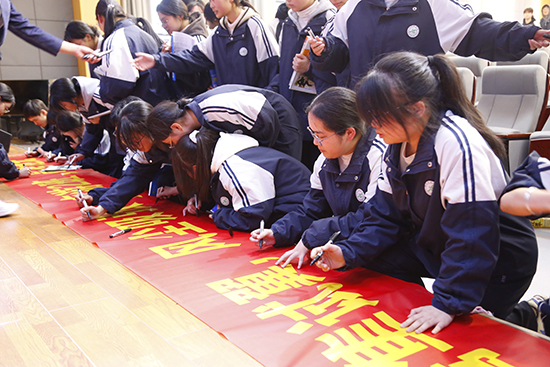 講座的最后環(huán)節(jié),氣氛莊重而熱烈。一條條凝聚著班級備考沖刺力量的橫幅被展開,各班同學依次上臺,鄭重地簽下自己的名字。