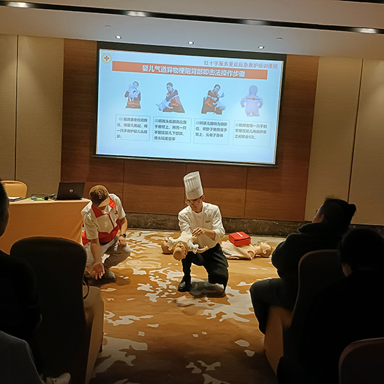 本次培訓(xùn)特邀浙江省紅十字會(huì)一級(jí)應(yīng)急救護(hù)師丁柏偉進(jìn)行授課。針對(duì)酒店行業(yè)的工作特性,丁老師重點(diǎn)講解了氣道異物梗阻的發(fā)生機(jī)理、易發(fā)人群識(shí)別及現(xiàn)場(chǎng)救護(hù)方法,并系統(tǒng)教授了心肺復(fù)蘇(CPR)的技能要點(diǎn)。